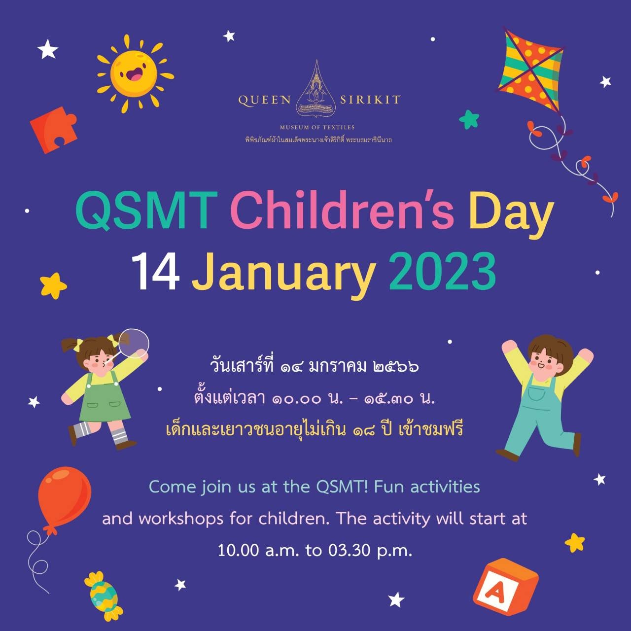 พิพิธภัณฑ์ผ้าฯ ชวนน้องๆ สนุกกับกิจกรรมต้อนรับวันเด็กแห่งชาติ ๒๕๖๖ ร่วมระบายสีชุดไทยพระราชนิยม ตกแต่งลายผ้าไทยจากเศษผ้าไหม และนำชมนิทรรศการ