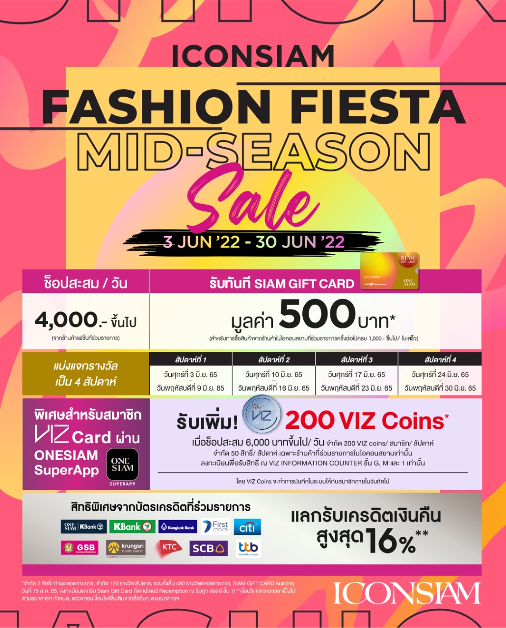 ไอคอนสยาม เอาใจนักช้อป จัดแคมเปญ “ICONSIAM FASHION FIESTA MID-SEASON SALE” ต้อนรับเทศกาลแฟชั่นสุดเฟียร์ส กับฤดูแห่งการเซลล์แบบสุดปัง รับ Siam Gift Card ทันที เมื่อช้อปสะสมครบ 4,000 บาทขึ้นไป !!! ตั้งแต่วันนี้ – 30 มิ.ย. ศกนี้