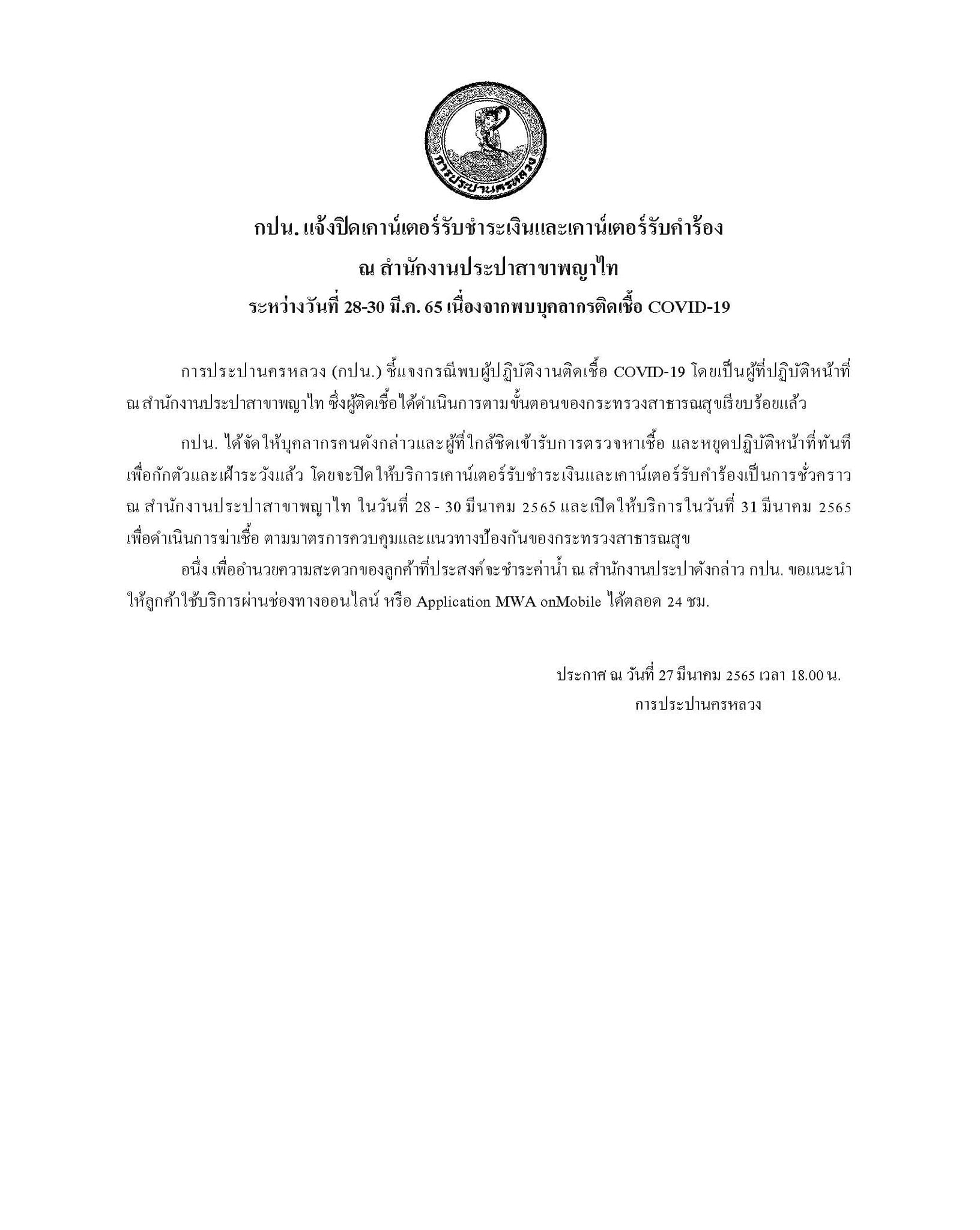 กปน. แจ้งปิดเคาน์เตอร์รับชำระเงินและเคาน์เตอร์รับคำร้อง ณ สำนักงานประปาสาขาพญาไท ระหว่างวันที่ 28-30 มี.ค. 65 เนื่องจากพบบุคลากรติดเชื้อ COVID-19