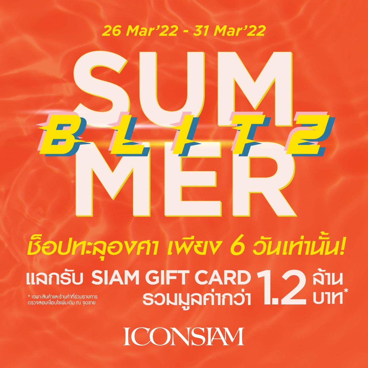 ไอคอนสยาม จัดแคมเปญ “SUMMER BLITZ” ช้อปทะลุองศา ช้อปสนุกแบบจุใจ พร้อมแลกรับ Siam Gift Card รวมมูลค่ากว่า 1.2 ล้านบาท พลาดไม่ได้ 26 – 31 มีนาคม 2565 เพียง 6 วันเท่านั้น!!