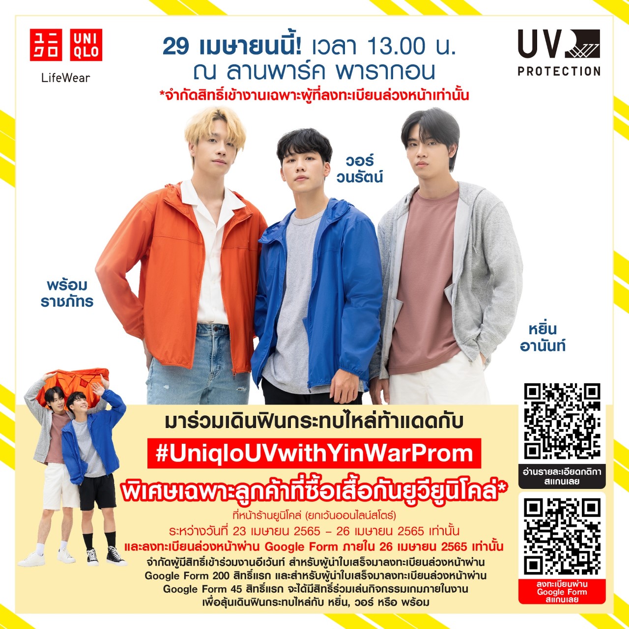ยูนิโคล่ชวนร่วมสนุกเดินฟินกระทบไหล่ท้าแดด พร้อมค้นหา #กันแดดที่สวมใส่ได้ จากเสื้อกันยูวีของยูนิโคล่ ไปกับ ‘หยิ่น, วอร์ และ พร้อม’ 29 เมษายนนี้! เฉพาะ 200 คนแรกที่ลงทะเบียนออนไลน์เท่านั้น