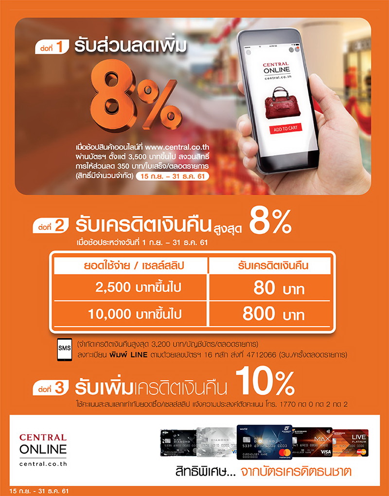 ลูกค้าบัตรเครดิตธนชาต ช้อปผ่าน www.central.co.th รับส่วนลดเพิ่มทันที 8% พร้อมเครดิตเงินคืน 2 ต่อ รวม 18%