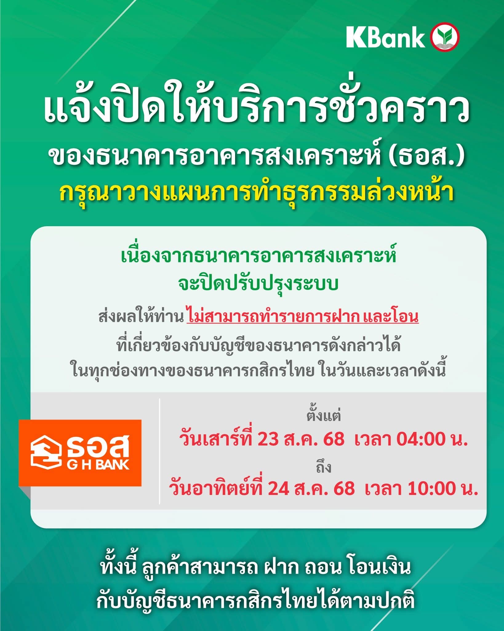 แจ้งปิดให้บริการชั่วคราวของธนาคารอาคารสงเคราะห์ (ธอส.)