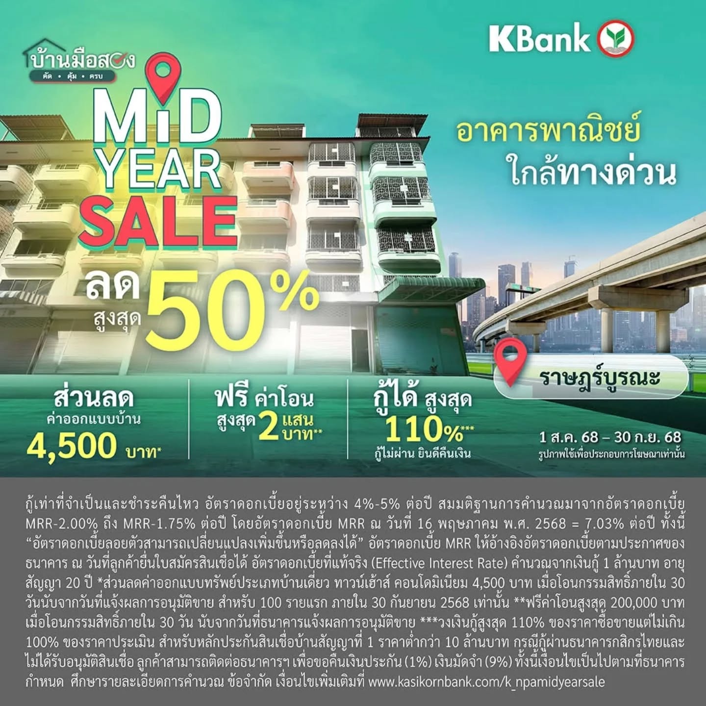 กสิกรไทย จัด MID YEAR SALE ลดสูงสุด 50 % อาคารพาณิชย์โซนราษฎร์บูรณะ ทำเลดีเดินทางสะดวก ใกล้ทางด่วน