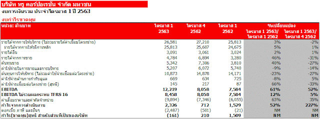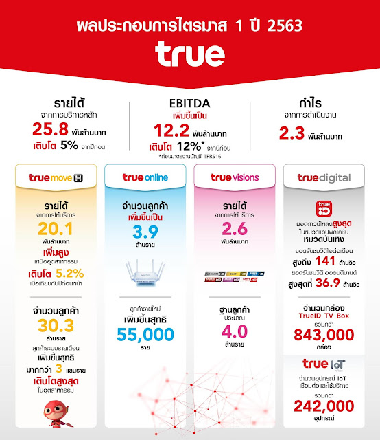 กลุ่มทรู รายงานผลการดำเนินงาน รายได้เติบโตต่อเนื่องที่ร้อยละ 3 และรายได้จากบริการหลักเติบโตร้อยละ 5 จากปีก่อน ในขณะที่ EBITDA เติบโตแข็งแกร่งร้อยละ 12 เมื่อเทียบกับปีก่อนเป็น 8.5 พันล้านบาท หลังการปรับมาใช้มาตรฐานบัญชี TFRS 16 EBITDA เพิ่มขึ้นเป็น 12.2 พันล้านบาท และมีกำไรจากการดำเนินงาน (Operating profit) เป็น 2.3 พันล้านบาท ส่วนใหญ่มาจากรายได้การให้บริการของทรูมูฟ เอช ที่เพิ่มในอัตราร้อยละ 5.2 จากปีก่อน เหนือกว่าค่าเฉลี่ยอุตสาหกรรม รวมทั้งมีฐานผู้ใช้บริการรายเดือนเพิ่มขึ้นสุทธิมากกว่า 3 แสนราย สวนทางกับผู้ให้บริการรายอื่นในอุตสาหกรรมที่มีรายได้ลดลงในไตรมาส 1 ปี 2563 ทั้งนี้ กลุ่มทรูจะมุ่งเน้นในการเพิ่มวินัยทางการเงิน บริหารค่าใช้จ่ายและเพิ่ม productivity ในทุกภาคส่วน เพื่อสร้างกำไรที่เติบโตอย่างยั่งยืนและพร้อมปรับตัวรับมือกับสถานการณ์เศรษฐกิจภายใต้ COVID-19 ต่อไป