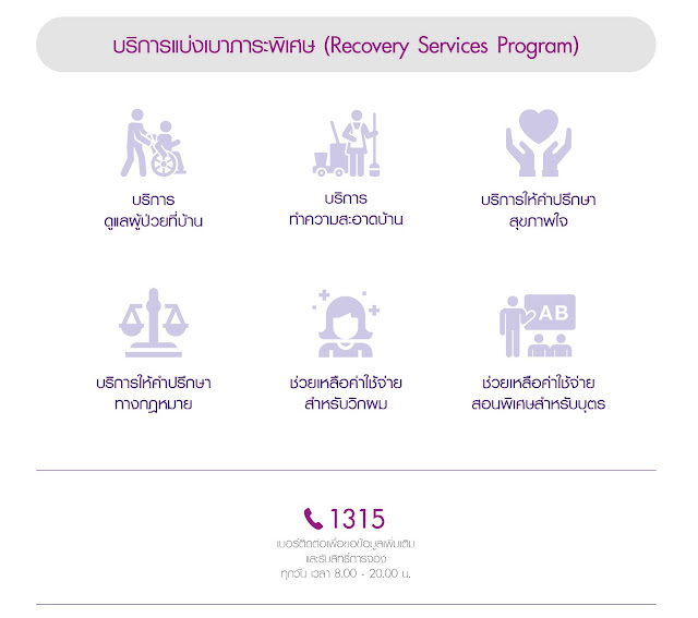 บริการแบ่งเบาภาระพิเศษ (Recovery Services Program)ไม่เพียงแต่จะช่วยดูแลผู้ถือกรมธรรม์ แต่ยังรวมไปถึงสมาชิกในครอบครัวด้วย ซึ่งมาพร้อมกับ 6 ตัวช่วยพิเศษ ดังนี้