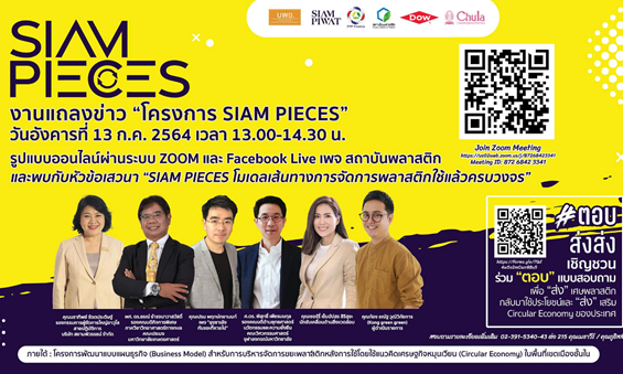 คณะวิศวกรรมศาสตร์ จุฬาลงกรณ์มหาวิทยาลัย ร่วมกับ สถาบันพลาสติก และ บริษัท สยามพิวรรธน์ จำกัด จุฬาลงกรณ์มหาวิทยาลัย และเครือข่ายพันธมิตร สร้างสรรค์โครงการพัฒนาแบบแผนธุรกิจ (Business Model) สำหรับการบริหารจัดการขยะพลาสติกหลังการใช้โดยใช้แนวคิดเศรษฐกิจหมุนเวียน (Circular Economy) เพื่อให้เกิดการบริหารจัดการของพลาสติกหลังการใช้งานในภาพรวมของทั้ง Value Chain จึงจําเป็นต้องมีการศึกษาพฤติกรรมและแนวทางการปรับเปลี่ยนพฤติกรรมของผู้บริโภค รวมถึงความต้องการของผู้มีส่วนเกี่ยวข้อง เพื่อเพิ่มอัตราการนําขยะพลาสติกไปใช้ประโยชน์ และป้องกันขยะพลาสติกหลุดรอดออกสู่สิ่งแวดล้อมอย่างยั่งยืน ตามหลักแนวคิดเศรษฐกิจหมุนเวียน (Circular Economy) โดยกิจกรรมในครั้งนี้ได้กำหนดจัดงานแถลงข่าวและงานเสวนาออนไลน์ในหัวข้อ “SIAM PIECES โมเดลเส้นทางการจัดการพลาสติกใช้แล้วครบวงจร” ในวันอังคารที่ 13 กรกฎาคม 2564 (ZOOM Application) เวลา 13.00-14.30 น. โดยผู้สนใจสามารถสมัครเข้าร่วมกิจกรรมรูปแบบออนไลน์ได้ที่ https://us02web.zoom.us/j/87268423341#success