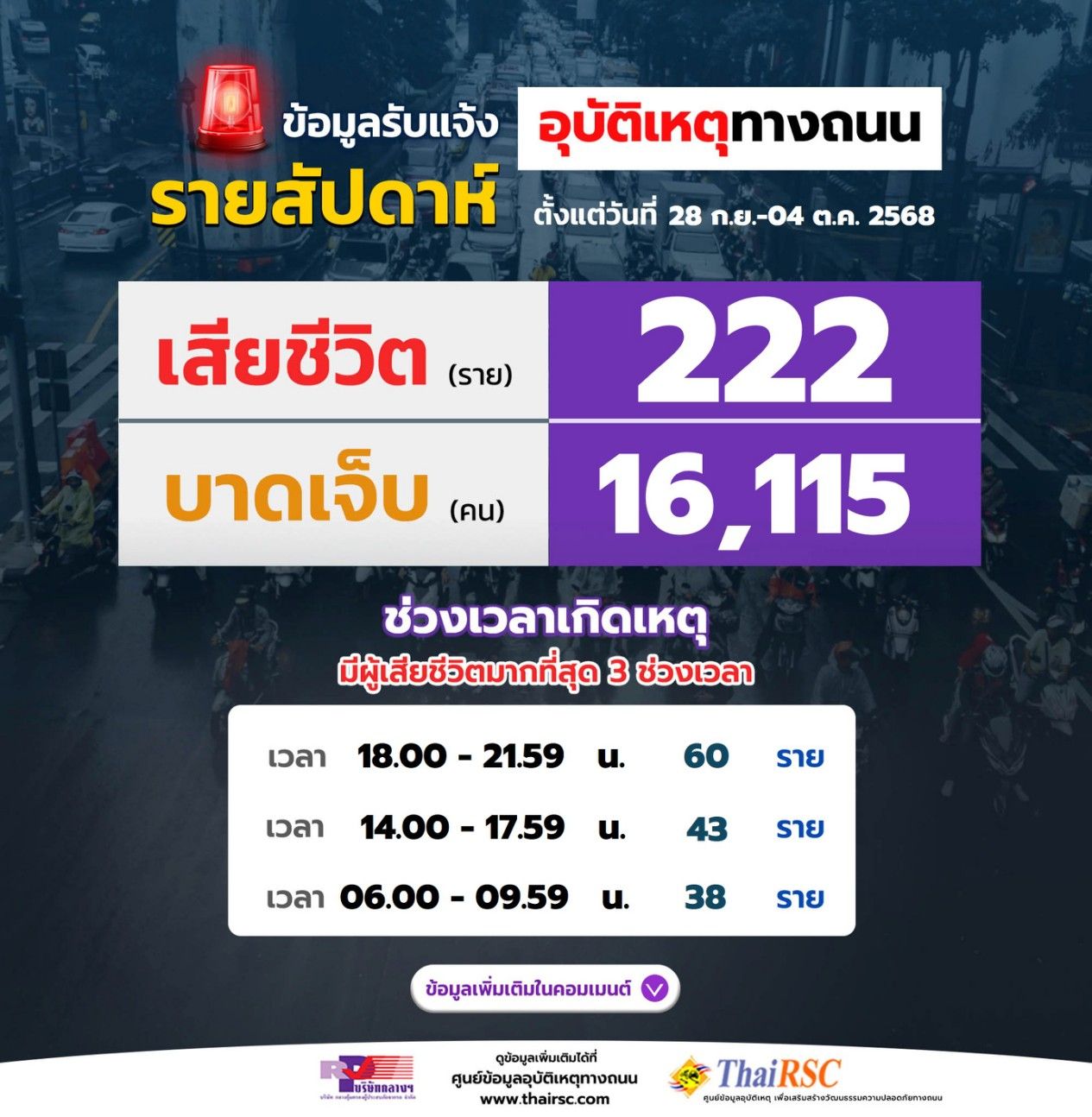 ศูนย์รับแจ้งเหตุบริษัทกลางคุ้มครองฯ เผยยอดอุบัติเหตุทางถนน รายสัปดาห์ ระหว่างวันที่ 28 ก.ย. - 4 ต.ค. 2568