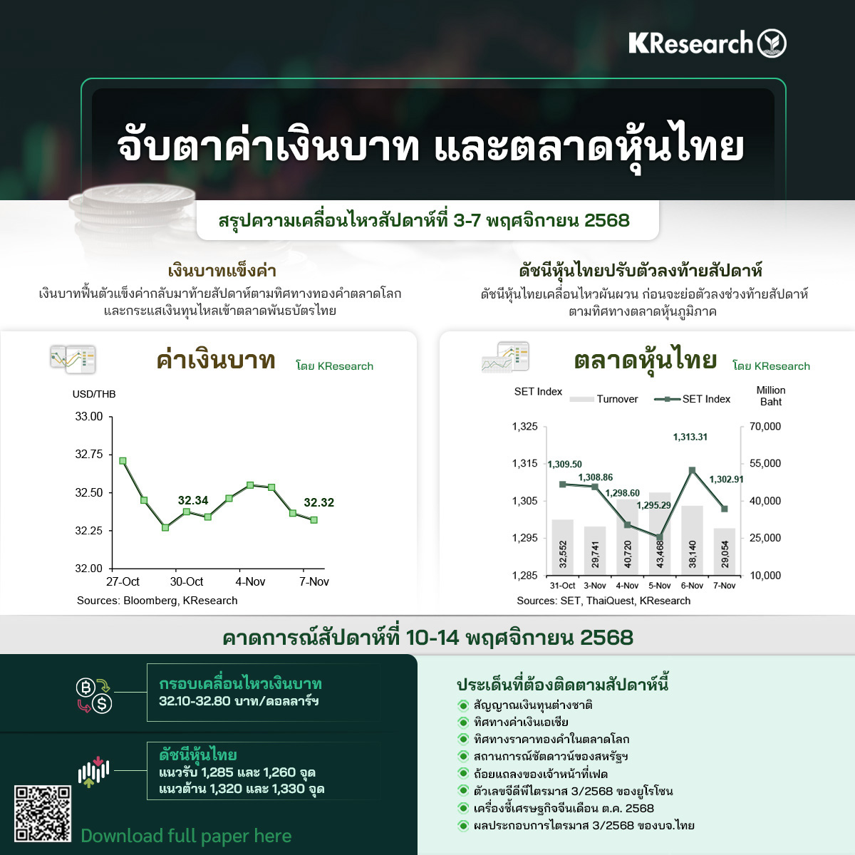 ศูนย์วิจัยกสิกรไทย สรุป ค่าเงินบาท และตลาดหุ้นไทย (สัปดาห์ที่ 3-7 พ.ย. 68)