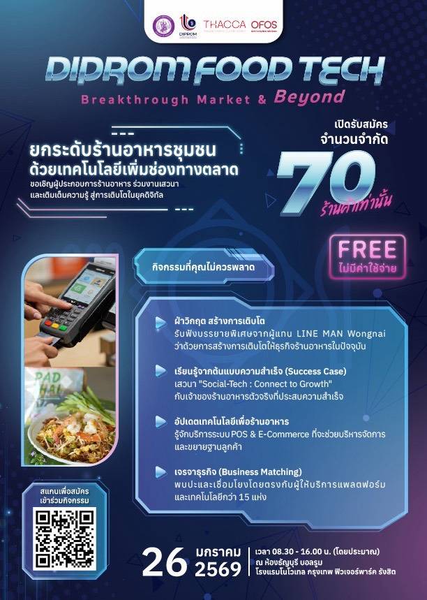 งาน DIPROM Food Tech: Breakthrough Market & Beyond มีวัตถุประสงค์เพื่อช่วยให้ผู้ประกอบการธุรกิจร้านอาหารยกระดับศักยภาพของตนเองด้วยการเชื่อมโยงกับเทคโนโลยีเพิ่มช่องทางตลาด เพื่อเพิ่มยอดขาย เข้าถึงลูกค้าใหม่ และใช้เทคโนโลยีมาช่วยบริหารร้านให้ “ง่ายขึ้น แต่โตขึ้น” นอกจากนี้ ธุรกิจร้านอาหารที่สมัครเข้าร่วมกิจกรรมยังจะได้พบกับกิจกรรมดี ๆ ที่รวมเทคโนโลยี การตลาด และเครือข่ายธุรกิจไว้ในที่เดียว อาทิ การเรียนรู้ จากตัวอย่างความสำเร็จ การอัปเดตเครื่องมือดิจิทัลสำหรับร้านอาหาร รวมทั้งการเจรจาธุรกิจกับแพลตฟอร์มชั้นนำกว่า 15 แห่ง