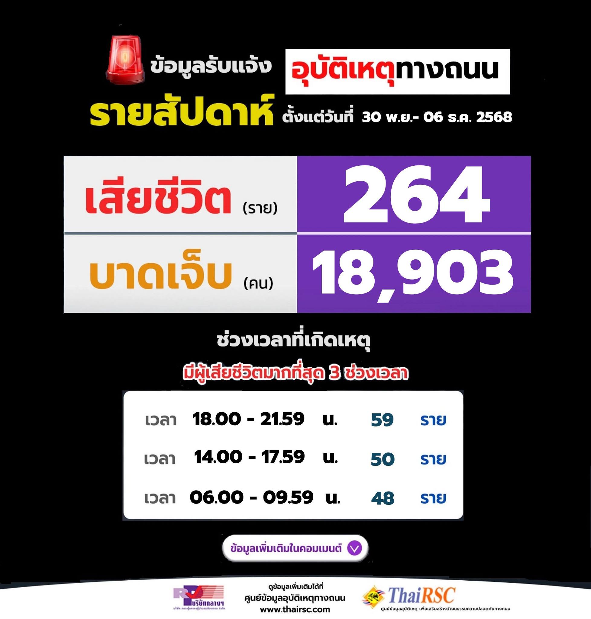 ศูนย์รับแจ้งเหตุบริษัทกลางคุ้มครองฯ เผยยอดอุบัติเหตุทางถนน รายสัปดาห์ ระหว่างวันที่ 30 พ.ย. - 6 ธ.ค. 2568