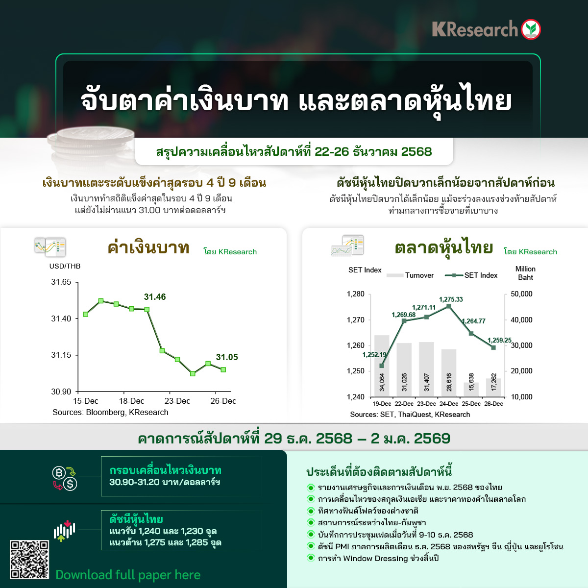 - ศูนย์วิจัยกสิกรไทย ระบุ ส่งออกไทยเดือนพ.ย. 2568 ขยายตัวเร่งขึ้นที่ 7.1%YoY