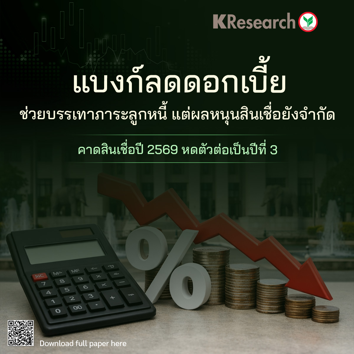 ศูนย์วิจัยกสิกรไทย เผย แบงก์ลดดอกเบี้ยช่วยบรรเทาภาระลูกหนี้ แต่ผลหนุนสินเชื่อยังจำกัด คาดสินเชื่อปี 2569 หดตัวต่อเป็นปีที่ 3