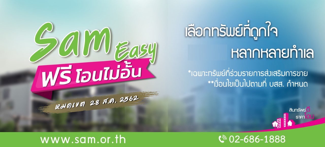 นายนิยต มาศะวิสุทธิ์ กรรมการผู้จัดการ บริษัท บริหารสินทรัพย์สุขุมวิท จำกัด (บสส.) หรือ SAM เปิดเผยว่า SAM ประกาศขยายเวลาโปรโมชั่นสุดฮอต “SAM Easy ฟรีโอนไม่อั้น” หลังได้รับความสนใจจากลูกค้าอย่างมากในช่วงที่ผ่านมา โดย SAM ออกค่าธรรมเนียมการโอนกรรมสิทธิ์ตามจริงให้แก่ลูกค้าที่ซื้อทรัพย์ NPA ที่ร่วมรายการส่งเสริมการขายในโปรโมชั่นนี้ด้วยวิธีซื้อตรง ตั้งแต่วันนี้ หมดเขต 28 สิงหาคม 2562 ทั้งนี้ รายละเอียดการรับสิทธิ์โปรโมชั่นต่างๆ เป็นไปตามเงื่อนไขที่ SAM กำหนด สอบถามเพิ่มเติมได้ที่ Call Center 02-686-1888 หรือดูรายละเอียดทรัพย์สินได้ที่เว็บไซต์ www.sam.or.th แอปพลิเคชัน SAM NPA ทั้งระบบ Android และ IOS รวมทั้งอีกหลากหลายช่องทางบนออนไลน์ ทั้ง Line โดยแอด ID Line @Samline สานฝันต่อยอดสินทรัพย์กับ SAM บน Facebook Fanpage และ SAM NPA Channel บน YouTube ล่าสุดเพิ่มช่องทาง Twitter เพื่อติดตามข้อมูลข่าวสารดีๆ จาก SAM