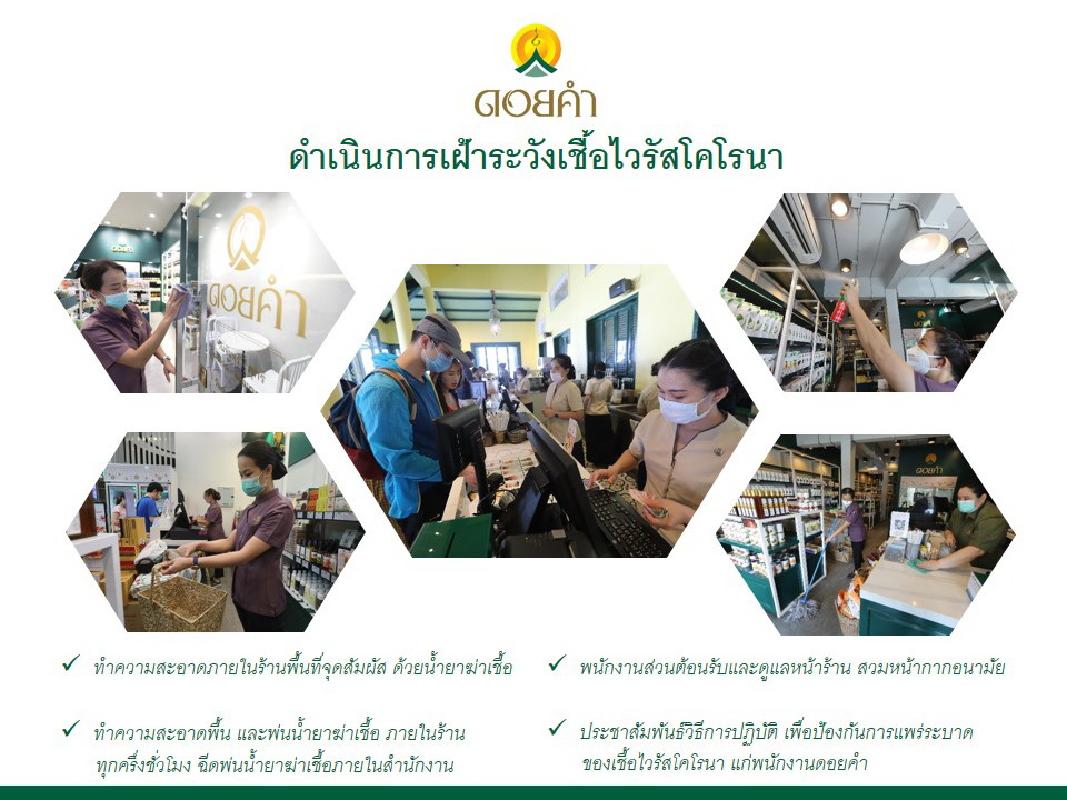 ๒.ป้องกันโดยให้พนักส่วนต้อนรับและดูแลหน้าร้าน ที่ต้องพบปะกับลูกค้า สวมหน้ากากอนามัย เพื่อป้องกันเชื้อไวรัสฯ ในส่วนของพนักงานดอยคำทุกคน ให้สวมหน้ากากอนามัย เพื่อป้องกันและการแพร่กระจาย