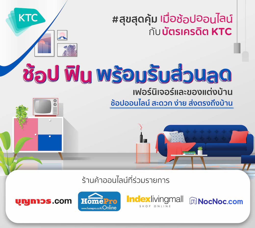 “เคทีซี” หรือ บริษัท บัตรกรุงไทย จำกัด (มหาชน) ร่วมกับ 4 พันธมิตรร้านเฟอร์นิเจอร์และของแต่งบ้านชั้นนำ ให้สมาชิกเลือกซื้อสินค้าถูกใจทางออนไลน์ และรับสิทธิพิเศษทั้งลดและรับเครดิตเงินคืน อาทิ โฮมโปร รับส่วนลดพิเศษทุกวันอังคาร 15% (จำกัดสูงสุด 300 บาท) เมื่อมียอดซื้อครบ 1,000 บาทและชำระเต็มจำนวนผ่าน www.homepro.co.th ตั้งแต่วันที่ 1 เมษายน 2563 – 31 พฤษภาคม 2563 บุญถาวร รับส่วนลดสูงสุด 700 บาท เมื่อช้อปผ่านทาง www.boonthavorn.com ครบ 9,000 บาท พร้อมแลกรับเงินคืน 10% และรับคะแนน KTC FOREVER สูงสุด X10 เพียงลงทะเบียนรับสิทธิ์ผ่าน www.ktc.co.th/shoponline ตั้งแต่วันที่ 1 มีนาคม 2563 – 30 เมษายน 2563 อินเด็กซ์ ลิฟวิ่งมอลล์ รับส่วนลด 5% สูงสุด 1,000 บาท เมื่อมียอดใช้จ่ายครบ 8,000 บาทขึ้นไปและชำระเต็มจำนวนที่ www.Indexlivingmall.com พร้อมระบุรหัสส่วนลด “KTC05” และแลกรับเครดิตเงินคืน 15% เมื่อใช้คะแนน KTC FOREVER เท่ากับยอดใช้จ่ายในการแลกรับ
