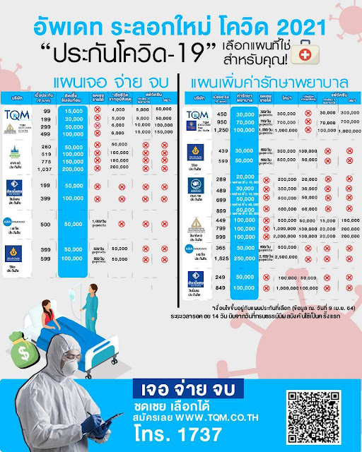 ปัจจุบัน TQM มีประกันโควิดให้เลือกทำได้ในหลายแผนความคุ้มครองจากพันธมิตรบริษัทประกันชั้นนำ ได้แก่ บริษัท กรุงเทพประกันภัย จำกัด (มหาชน) บริษัท สินทรัพย์ประกันภัย จำกัด (มหาชน) บริษัท เมืองไทยประกันภัย จำกัด (มหาชน) บริษัท ทิพยประกันภัย จำกัด (มหาชน) บริษัท วิริยะประกันภัย จำกัด (มหาชน) บริษัท อาคเนย์ประกันภัย จำกัด (มหาชน) และบริษัท เอเชียประกันภัย 1950 จำกัด (มหาชน) โดยมีเบี้ยประกันที่ไม่สูง เช่น ประกันแบบเจอจ่ายจบ ประกันแบบที่เน้นค่ารักษาพยาบาล แบบประกันที่ให้ความคุ้มครองการแพ้วัคซีนโควิด-19 ล่าสุด TQM ได้ร่วมกับ บริษัท กรุงเทพประกันภัย จำกัด (มหาชน) หรือ BKI ขายประกันโควิด-19 ที่เพิ่มความคุ้มครองค่าตรวจสำหรับครอบครัวของผู้ทำประกันกรณีผู้ทำประกันตรวจพบว่าติดเชื้อโควิด และมีค่าทำความสะอาดบ้านเพิ่มเติมให้อีกด้วย โดยบริการผ่านทุกช่องทางการขายทั้งออนไลน์และออฟไลน์ ซื้อให้ทั้งตนเองและซื้อให้คนอื่นได้ทาง Line Official TQM Insurance Broker และ Facebook TQM Insurance Broker เว็บไซต์ www.tqm.co.th หรือสายด่วน 1737 ตลอด 24 ชั่วโมง