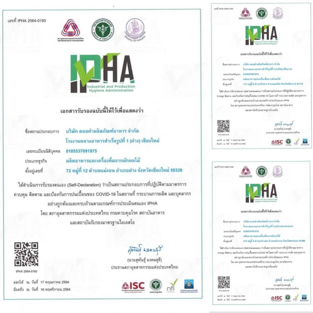 ด้วยเหตุนี้ บริษัท ดอยคำผลิตภัณฑ์อาหาร จำกัด ในฐานะผู้นำผลิตภัณฑ์เพื่อสุขภาพ ซึ่งใส่ใจและให้ความสำคัญเรื่องความปลอดภัยและมาตรฐานความสะอาดมาโดยตลอด จึงได้ยื่นเรื่องต่อ สภาอุตสาหกรรมแห่งประเทศไทย (ส.อ.ท.) ในฐานะองค์กรหลักภาคเอกชน และเป็นผู้จัดทำมาตรฐานสินค้าด้วยการออกเครื่องหมายรับรอง “IPHA” (Industrial and Production Hygiene Administration) โดยมีเป้าหมายให้โรงงานรับรองตนเอง หรือที่เรียกว่า self-declaration ระดับการสร้างมาตรฐานสุขอนามัย เพื่อสร้างความเชื่อมั่น อีกทั้งยังเป็นการรับรองว่าเป็นสถานประกอบการที่มีการบริหารจัดการสถานที่ กระบวนการผลิตและบุคลากรตามมาตรการร่วมและมาตรฐานด้านสุขอนามัย ซึ่งจะช่วยสร้างความมั่นใจให้กับคู่ค้าและผู้บริโภคในการซื้อสินค้าที่มีมาตรฐานปลอดภัยจาก COVID-19 ภายใต้ความร่วมมือของสภาอุตสาหกรรมแห่งประเทศไทย ร่วมกับกระทรวงสาธารณสุขและกระทรวงอุตสาหกรรม พร้อมหน่วยงานในสังกัด ได้แก่ กรมควบคุมโรค สถาบันอาหาร และสถาบันรับรองมาตรฐานไอเอสโอ