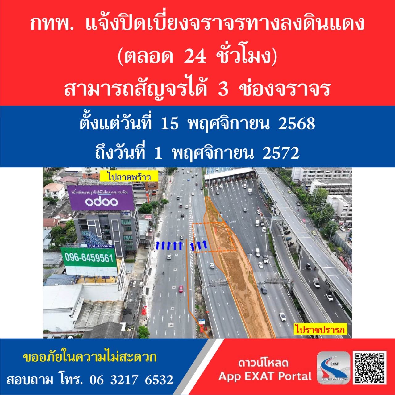 กทพ. แจ้งการปิดเบี่ยงการจราจรทางลงดินแดง ทางพิเศษเฉลิมมหานคร ตลอด 24 ชั่วโมง