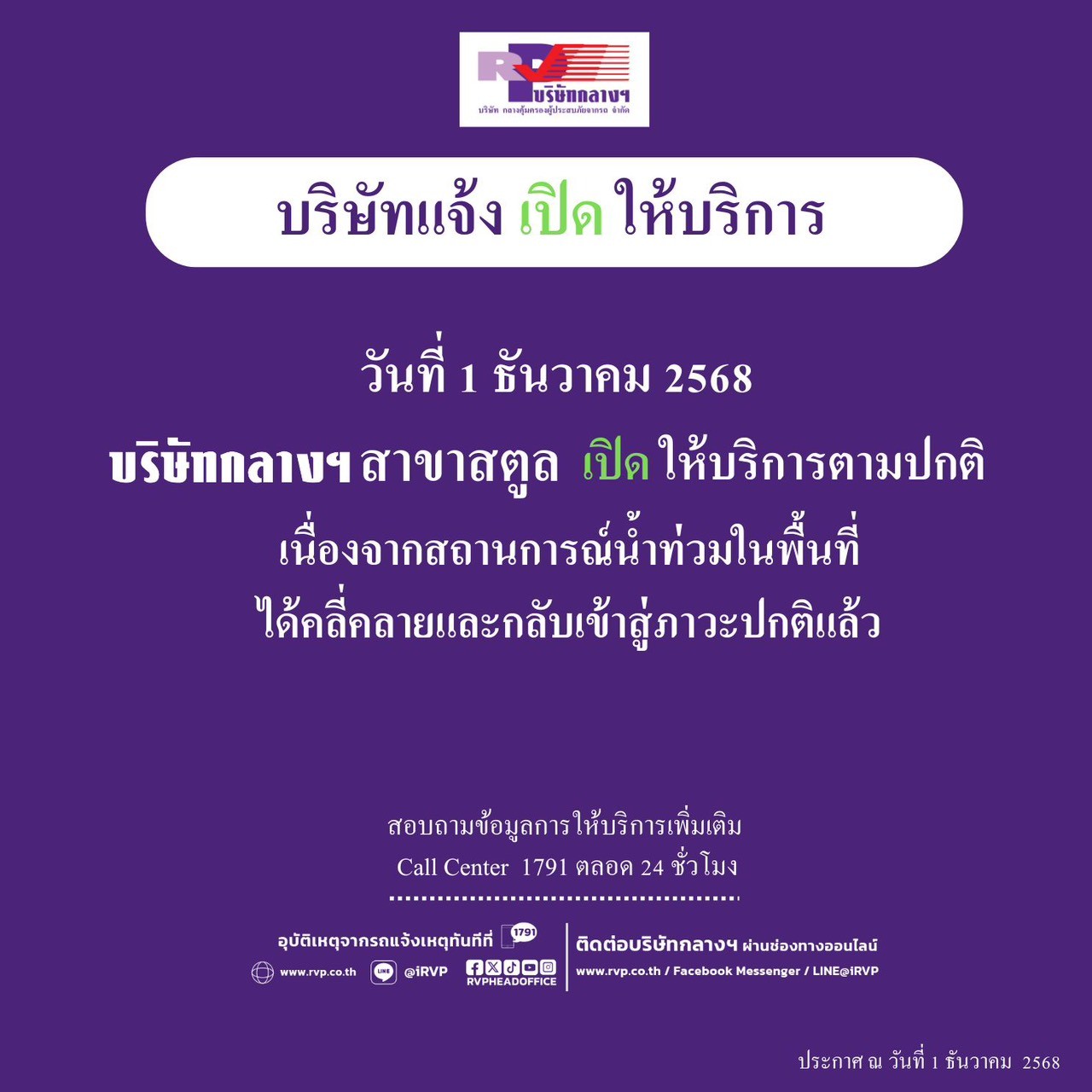 เนื่องจากเกิดเหตุการณ์น้ำท่วมบริเวณโดยรอบบริษัท กลางคุ้มครองผู้ประสบภัยจากรถ จำกัด สาขาสตูล ซึ่งส่งผลกระทบจนไม่สามารถเปิดให้บริการได้ ขณะนี้สถานการณ์ดังกล่าวได้กลับสู่ภาวะปกติ โดยบริษัทสามารถให้บริการประชาชนรวมทั้งหน่วยงานต่างๆ ที่เกี่ยวข้องได้อย่างปกติ ในวันที่ 1 ธันวาคม 2568 เป็นต้นไป