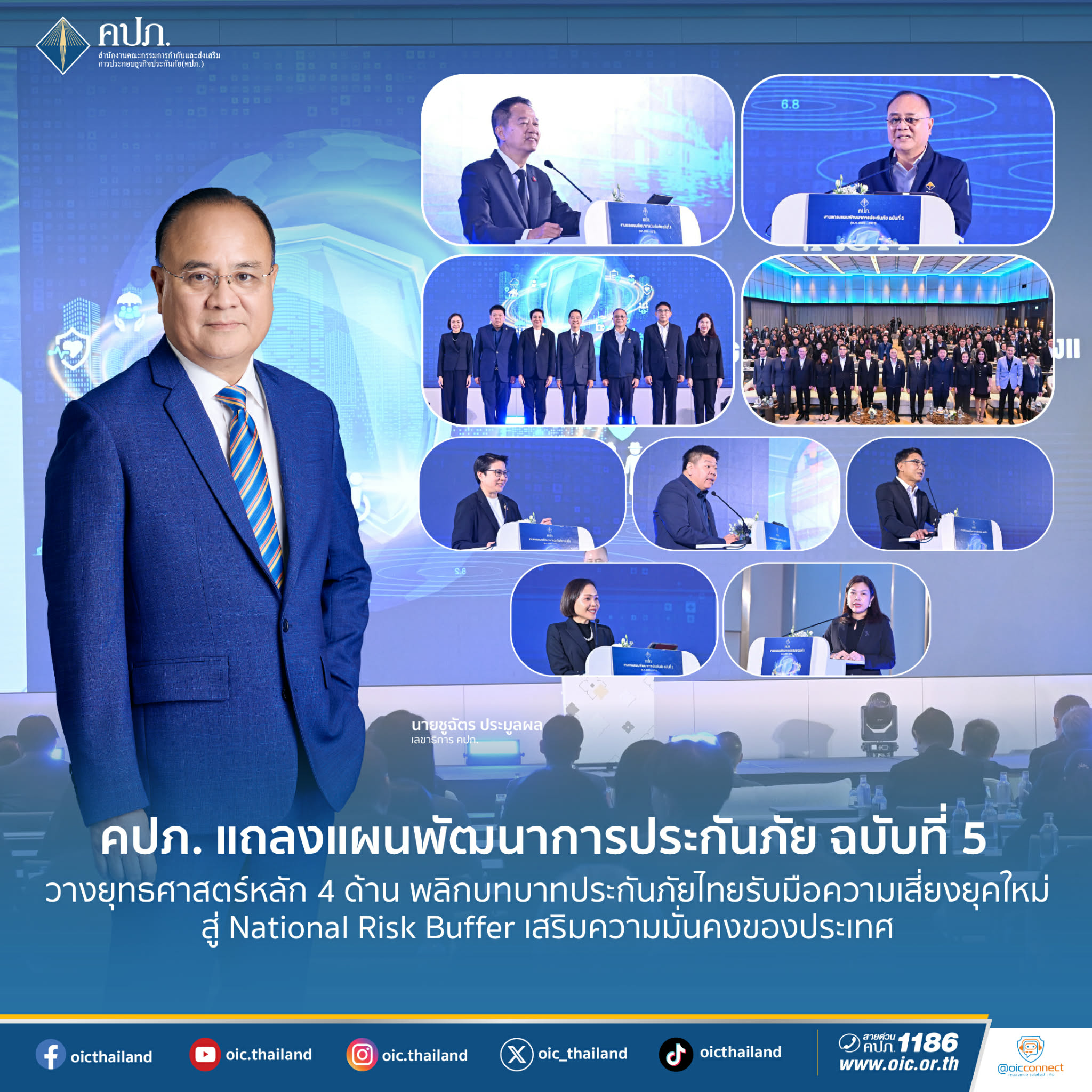 เมื่อวันที่ 3 กุมภาพันธ์ 2569 สำนักงานคณะกรรมการกำกับและส่งเสริมการประกอบธุรกิจประกันภัย (สำนักงาน คปภ.) จัดงานแถลงแผนพัฒนาการประกันภัย ฉบับที่ 5 (พ.ศ. 2569 – 2573) เพื่อสรุปภาพรวมการขับเคลื่อนทิศทางการพัฒนาอุตสาหกรรมประกันภัยไทยในระยะต่อไป ซึ่งได้รับเกียรติจาก นายบุณยฤทธิ์ กัลยาณมิตร กรรมการผู้ทรงคุณวุฒิด้านการประกันภัย และประธานอนุกรรมการขับเคลื่อนแผนพัฒนาการประกันภัย กล่าวปาฐกถาพิเศษ เรื่อง “บทบาทของระบบประกันภัยในการบริหารความเสี่ยงภัยของประเทศ และ นายชูฉัตร ประมูลผล เลขาธิการคณะกรรมการกำกับและส่งเสริมการประกอบธุรกิจประกันภัย (เลขาธิการ คปภ.) กล่าวสรุปภาพรวมการขับเคลื่อนแผนพัฒนาการประกันภัย ” โดยมีนายสุรินทร์ ตนะศุภผล ผู้ช่วยเลขาธิการ สายกลยุทธ์องค์กร กล่าวรายงานวัตถุประสงค์การจัดงาน ซึ่งผู้เข้าร่วมงานประกอบด้วย นายกสมาคมประกันชีวิตไทย นายกสมาคมประกันวินาศภัยไทยและประธานสภาธุรกิจประกันภัยไทย นายกสมาคมนายหน้าประกันภัยไทย นายกสมาคมตัวแทนประกันชีวิตและที่ปรึกษาทางการเงิน นายกสมาคมนักคณิตศาสตร์ประกันภัยแห่งประเทศไทย ผู้บริหารระดับสูงของสำนักงาน คปภ. ผู้แทนหน่วยงานภาครัฐ ภาคธุรกิจประกันภัย และสื่อมวลชน จำนวนประมาณ 300 คน ณ โรงแรม Grande Centre Point Prestige Bangkok