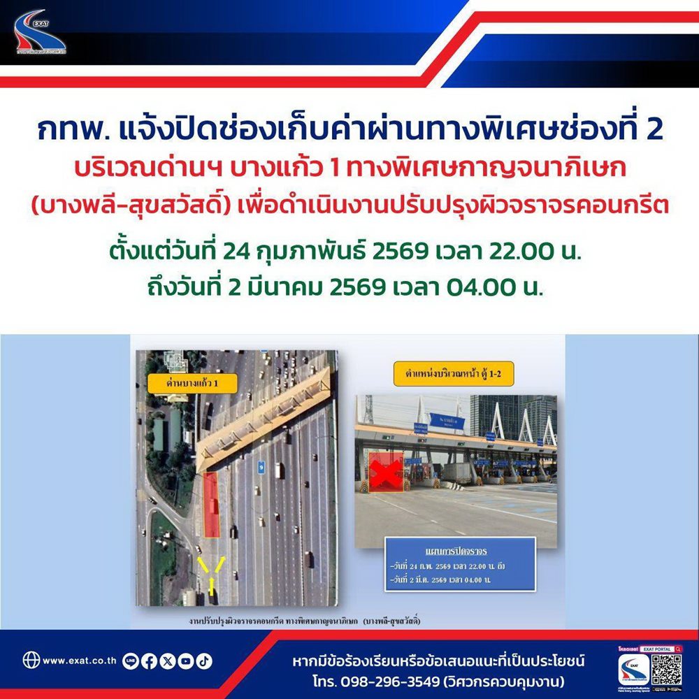 การทางพิเศษแห่งประเทศไทย (กทพ.) กระทรวงคมนาคม ได้ว่าจ้าง บริษัท ไออีทีแอล จำกัด เพื่อดำเนินงานปรับปรุงผิวจราจรคอนกรีตช่องเก็บค่าผ่านทางพิเศษยกระดับ บริเวณด่านเทพารักษ์ ทางพิเศษกาญจนาภิเษก (บางพลี-สุขสวัสดิ์) โดยผู้รับจ้างจะเข้าดำเนินงานปรับปรุงผิวจราจรบริเวณหน้าช่องเก็บค่าผ่านทางพิเศษ ช่องที่ 1 และ 2 ของด่านเก็บค่าผ่านทางพิเศษบางแก้ว 1 จึงมีความจำเป็นจะต้อง ปิดช่องเก็บค่าผ่านทางพิเศษ ช่องที่ 2 ของด่านเก็บค่าผ่านทางพิเศษบางแก้ว 1 ทางพิเศษกาญจนาภิเษก (บางพลี-สุขสวัสดิ์) ตั้งแต่วันที่ 24 กุมภาพันธ์ 2569 เวลา 22.00 น. ถึงวันที่ 2 มีนาคม 2569 เวลา 04.00 น.