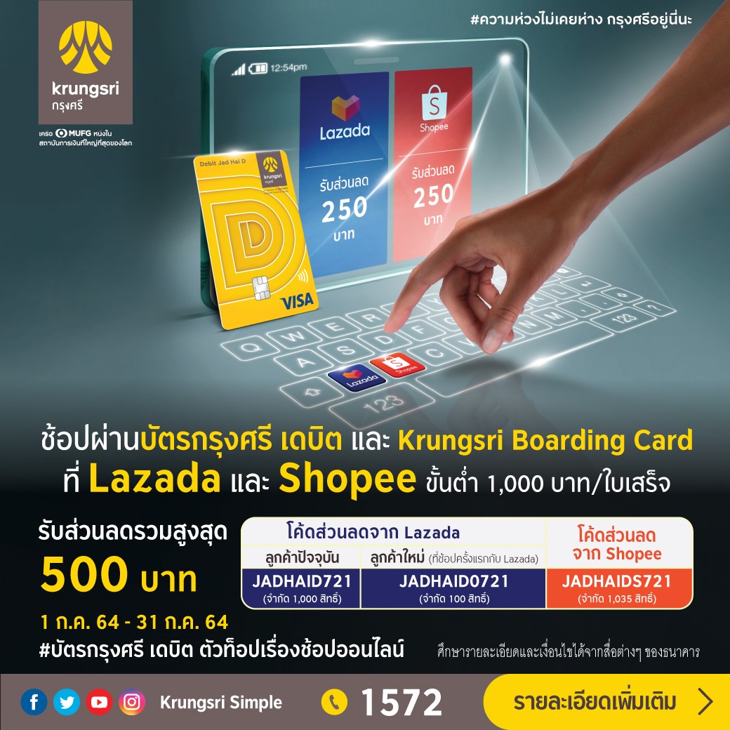 กรุงศรี แจกโค้ดคุ้มลดทุกเดือน ช้อปออนไลน์ที่ Lazada และ Shopee ลดสูงสุด 500 บาท