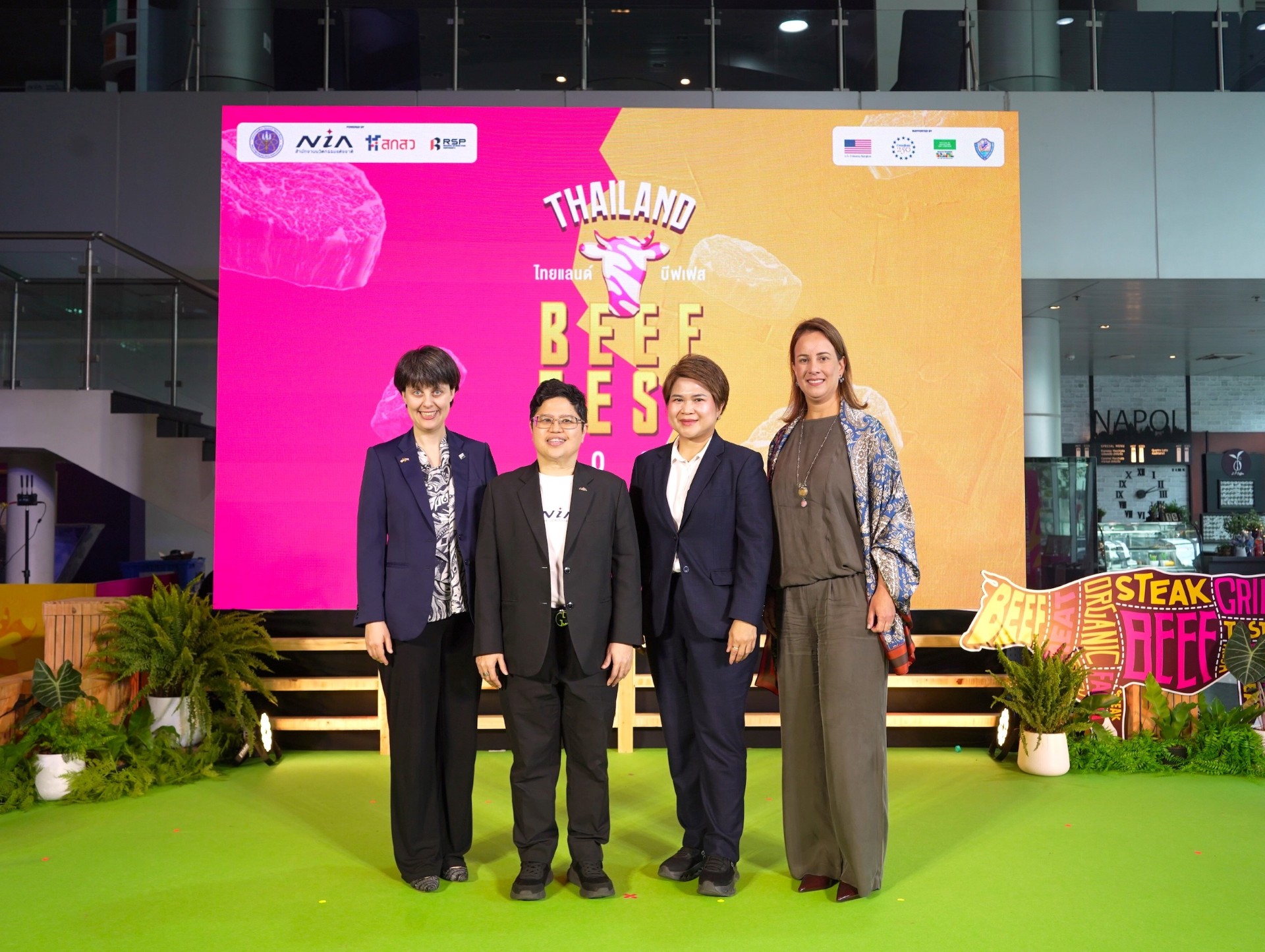 กรุงเทพฯ 16 มกราคม 2569 – ดร.กริชผกา บุญเฟื่อง (ที่ 2 จากซ้าย) ผู้อำนวยการสำนักงานนวัตกรรมแห่งชาติ NIA พร้อมด้วย ผศ.ดร.ปภากร พิทยชวาล (ที่ 3 จากซ้าย) ผู้อำนวยการอุทยานวิทยาศาสตร์ภาคตะวันออกเฉียงเหนือตอนล่าง 2 ดร. มาเรีย ราโฮฟสกายา (คนซ้าย) ผู้แทนจากสถานเอกอัครราชทูตสหรัฐอเมริกาประจำประเทศไทย และนางแอนนา โคโรลินา มิแรนด้า ลามี่ (คนขวา) ผู้แทนจากสถานเอกอัครราชทูตบราซิลประจำประเทศไทย ร่วมประกาศความสำเร็จในการยกระดับอุตสาหกรรมโคเนื้อคุณภาพสูงของไทย ผ่านงาน "Thailand Beef Fest 2026" สุดยอดมหกรรมเนื้อไทยครั้งยิ่งใหญ่ ที่จะจัดขึ้นในวันที่ 5-7 กุมภาพันธ์ 2569 ณ ตลาดนัดเลียบด่วน-แดนเนรมิต กรุงเทพมหานคร เพื่อเปิดเวทีแลกเปลี่ยนองค์ความรู้ สร้างระบบนิเวศนวัตกรรมด้านการตลาด และยกระดับมาตรฐานการผลิตอุตสาหกรรมเนื้อโคไทยให้เทียบเท่าตลาดเนื้อโคพรีเมียมในระดับสากล โดยกิจกรรมดังกล่าวจัดขึ้นเมื่อเร็ว ๆ นี้ ณ อาคารสำนักงานนวัตกรรมแห่งชาติ (องค์การมหาชน) ถนนโยธี