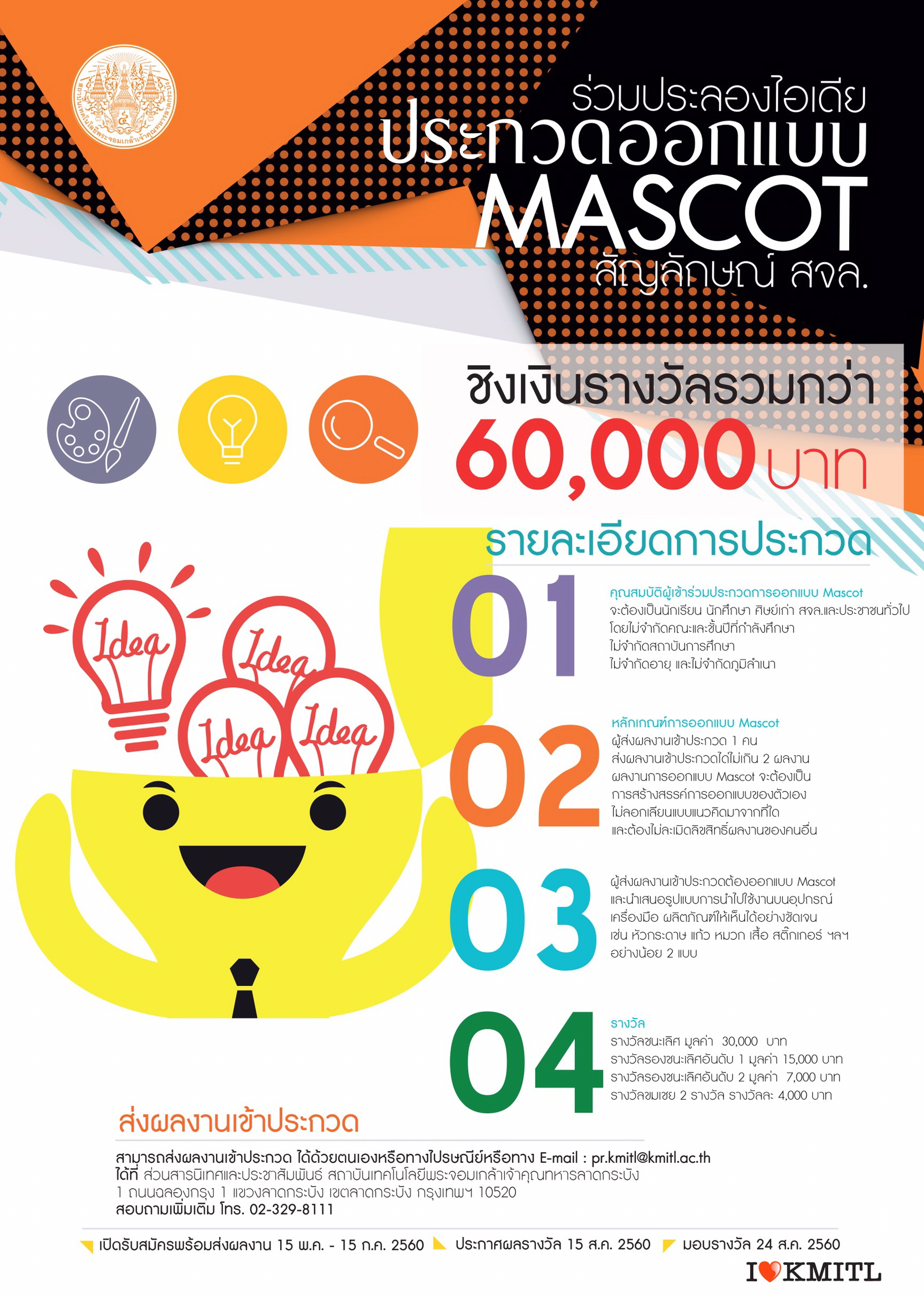 กรุงเทพฯ 24 พฤษภาคม 2560 – สถาบันเทคโนโลยีพระจอมเกล้าเจ้าคุณทหารลาดกระบัง หรือ สจล. ชวนนักเรียน นักศึกษา และประชาชนทั่วไป ที่รักการออกแบบและมีไอเดียบรรเจิด ร่วมประลองไอเดียประกวดออกแบบ MASCOT สัญลักษณ์ สจล. ชิงเงินรางวัลรวมกว่า 60,000 บาท ภายใต้เงื่อนไขผลงานการออกแบบต้องเป็นการสร้างสรรค์ของตัวเอง ไม่ลอกเลียนแบบแนวคิดมาจากที่ใดและต้องไม่ละเมิดลิขสิทธิ์ผลงานของผู้อื่น พร้อมนำเสนอรูปแบบการนำไปใช้งานบนอุปกรณ์ เครื่องมือ และผลิตภัณฑ์ต่างๆ ให้เห็นอย่างชัดเจน เช่น หัวกระดาษ แก้ว หมวก เสื้อ สติ๊กเกอร์ ฯลฯ สามารถส่งผลงานเข้าประกวดได้ด้วยตนเองและทางไปรษณีที่ ส่วนสารนิเทศและประชาสัมพันธ์ สถาบันเทคโนโลยีพระจอมเกล้าเจ้าคุณทหารลาดกระบัง 1 ถนนฉลองกรุง 1 แขวงลาดกระบัง เขตลาดกระบัง กรุงเทพฯ 10520 หรือทางอีเมล This email address is being protected from spambots. You need JavaScript enabled to view it. ได้ตั้งแต่วันนี้ – 15 ก.ค. 2560 สอบถามรายละเอียดเพิ่มเติม โทร. 02-329-8111