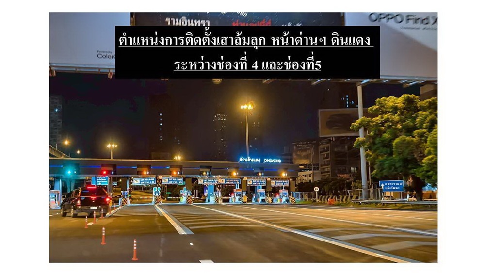 กทพ. ติดตั้งเสาล้มลุกบริเวณหน้าด่านฯ ดินแดง ทางพิเศษเฉลิมมหานคร เพื่อแก้ปัญหารถในช่องจ่ายเงินสดมาเบียดแทรกรถผู้ใช้บริการที่จะเข้าช่อง Easy Pass