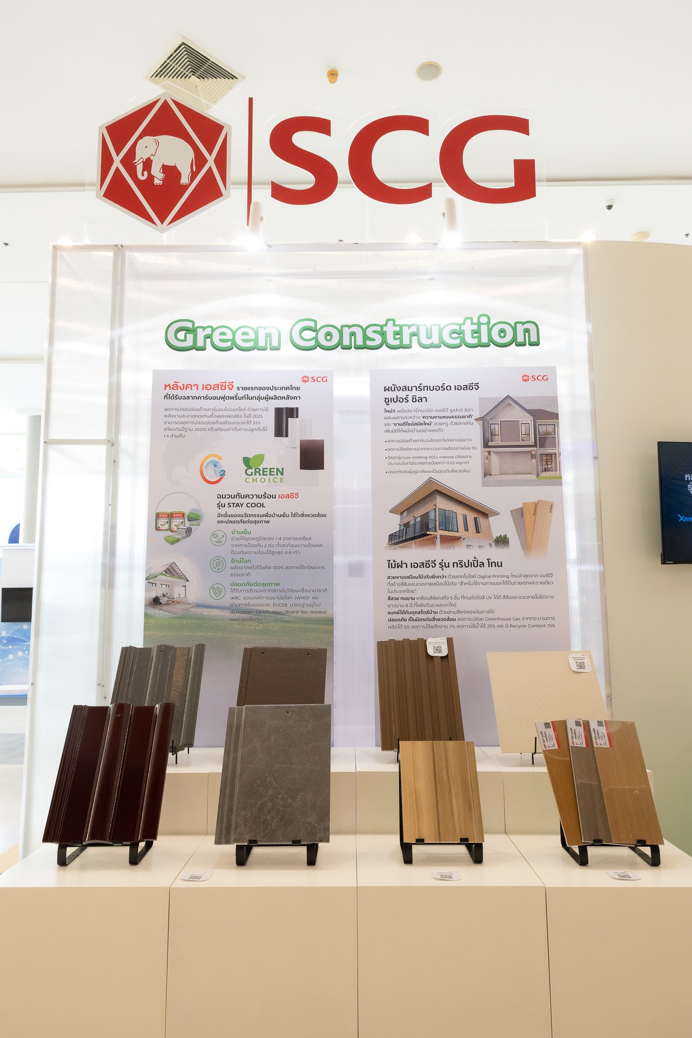 - หลังคา SCG ผู้ผลิตรายแรกในประเทศไทยที่ได้รับฉลากคาร์บอนฟุตพริ้นต์ของผลิตภัณฑ์ สามารถลดการปล่อยก๊าซเรือนกระจกได้ถึง 33% เทียบเท่าการปลูกต้นไม้กว่า 1.4 ล้านต้น