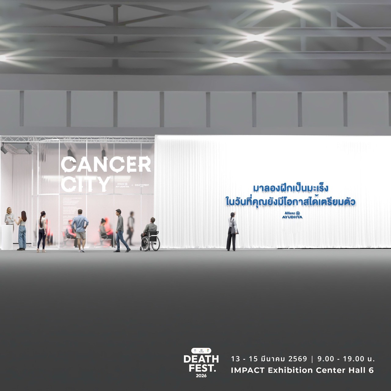 การเข้าร่วมงาน Death Fest 2026 และการเปิดพื้นที่ Cancer City Live Experience ในครั้งนี้ สะท้อนบทบาทของ อลิอันซ์ อยุธยา ในการสนับสนุนให้คนไทยมีความรู้ ความเข้าใจ และความพร้อมในการรับมือกับความเสี่ยงด้านสุขภาพ พร้อมส่งเสริมการวางแผนชีวิตและการดูแลสุขภาพอย่างยั่งยืน ผู้สนใจสามารถเข้าร่วมกิจกรรม Cancer City Live Experience by Allianz Ayudhya ได้ภายในงาน Death Fest 2026 ระหว่างวันที่ 13 – 15 มีนาคม 2569 เวลา 09.00 – 19.00 น. ณ IMPACT Exhibition Center Hall 6