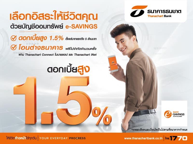 ธนชาตชวนออมกับ e-SAVINGS ให้ดอกเบี้ยสูงสุด 1.5% ตั้งแต่บาทแรก พร้อมขยายเพดานถึง 5 ล้านบาท