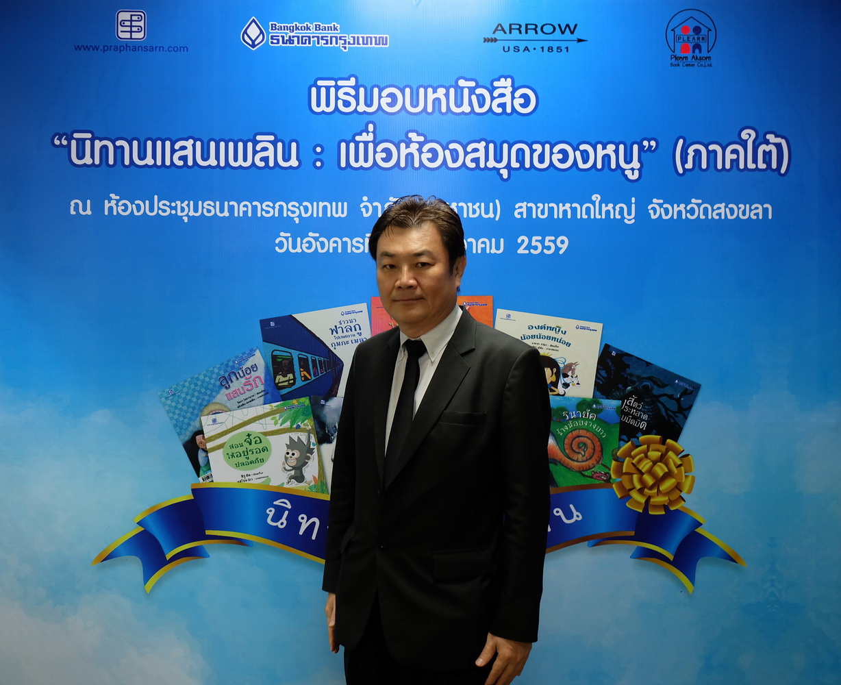 ซึ่งได้รับเกียรติจาก นายครรชิต กปิลกาญจน์ ปลัดอำเภอ หัวหน้ากลุ่มงานบริหารงานปกครอง, นางวรรญา ทิพย์ดนตรี ผู้อำนวยการสำนักงาน กศน. จังหวัดสงขลาและผู้อำนวยการ กศน. อำเภอต่างๆ เป็นตัวแทนรับมอบหนังสือนิทานสองภาษาชุด “นิทาน แสนเพลิน : เพื่อห้องสมุดของหนู (ภาคใต้)” จาก นายทวีลาภ ฤทธาภิรมย์ กรรมการบริหารและผู้ช่วยผู้จัดการใหญ่ ธนาคารกรุงเทพ จำกัด (มหาชน), นายอาทร เตชะธาดา กรรมการบริษัท สำนักพิมพ์ประพันธ์สาส์น จำกัด และนายพสคม ทองเจือ ตัวแทนกรรมการผู้จัดการ บริษัท เพลินอักษร บุ๊คเซ็นเตอร์ จำกัด (ร้านนายอินทร์หาดใหญ่) เพื่อเป็นสัญลักษณ์นำส่งต่อไปยังห้องสมุดโรงเรียน จำนวน 200 แห่ง