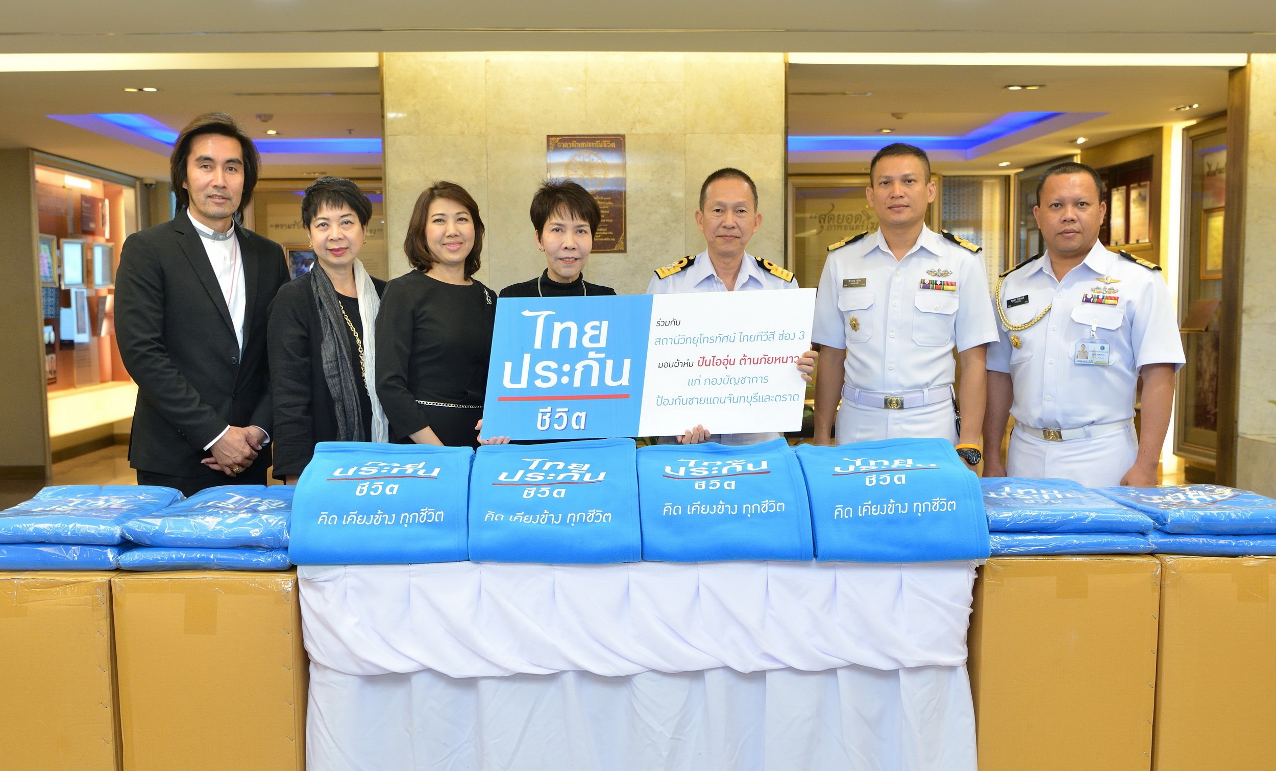 นาวาเอกพลวัต ดารานนท์ รองผู้อำนวยการ สำนักจิตวิทยา กรมกิจการพลเรือนทหารเรือ รับมอบผ้าห่มกันหนาวในโครงการ “ปันไออุ่น ต้านภัยหนาว” จำนวน 400 ผืนจากนางสาวภาสินี ปรีชาธนาพล ผู้อำนวยการฝ่าย กลุ่มองค์กรสัมพันธ์ บริษัท ไทยประกันชีวิต จำกัด (มหาชน) ซึ่งบริษัทฯ ร่วมกับสถานีวิทยุโทรทัศน์ไทยทีวีสี ช่อง 3 เพื่อนำไปมอบให้ประชาชนที่ยากไร้ในพื้นที่ของกองบัญชาการป้องกันชายแดนจันทบุรีและตราด ณ อาคารไทยประกันชีวิต