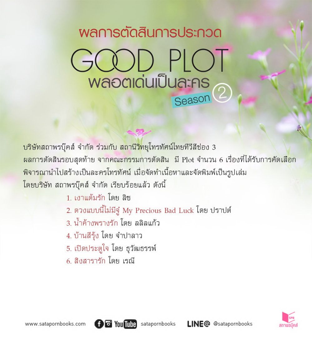 ผลการตัดสินรอบสุดท้าย Good Plot “พลอตเด่นเป็นละคร” ครั้งที่ 2 โดย บริษัทสถาพรบุ๊คส์ จำกัด ร่วมกับ สถานีวิทยุโทรทัศน์ไทยทีวีสีช่อง 3 มี Plot จำนวน 6 เรื่อง ที่จะจัดพิมพ์เป็นรูปเล่ม โดยบริษัท สถาพรบุ๊คส์ จำกัด และได้รับการคัดเลือกพิจารณานำไปสร้างเป็นละครโทรทัศน์ ทางช่อง 3 ดังนี้ 1. เงาแต้มรัก โดย ลิซ 2.ดวงแบบนี้ไม่มีจู๋ My Precious Bad Luck โดย ปราบต์ 3.น้ำค้างพรางรัก โดย ลลิลแก้ว 4.บ้านสีรุ้ง โดย จำปาลาว 5.เปิดประตูใจ โดย ธุวัฒธรรพ์ 6.สิงสารารัก โดย เรณี
